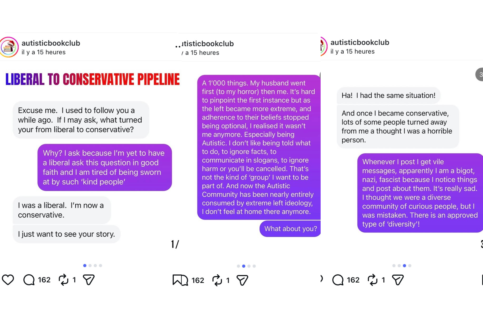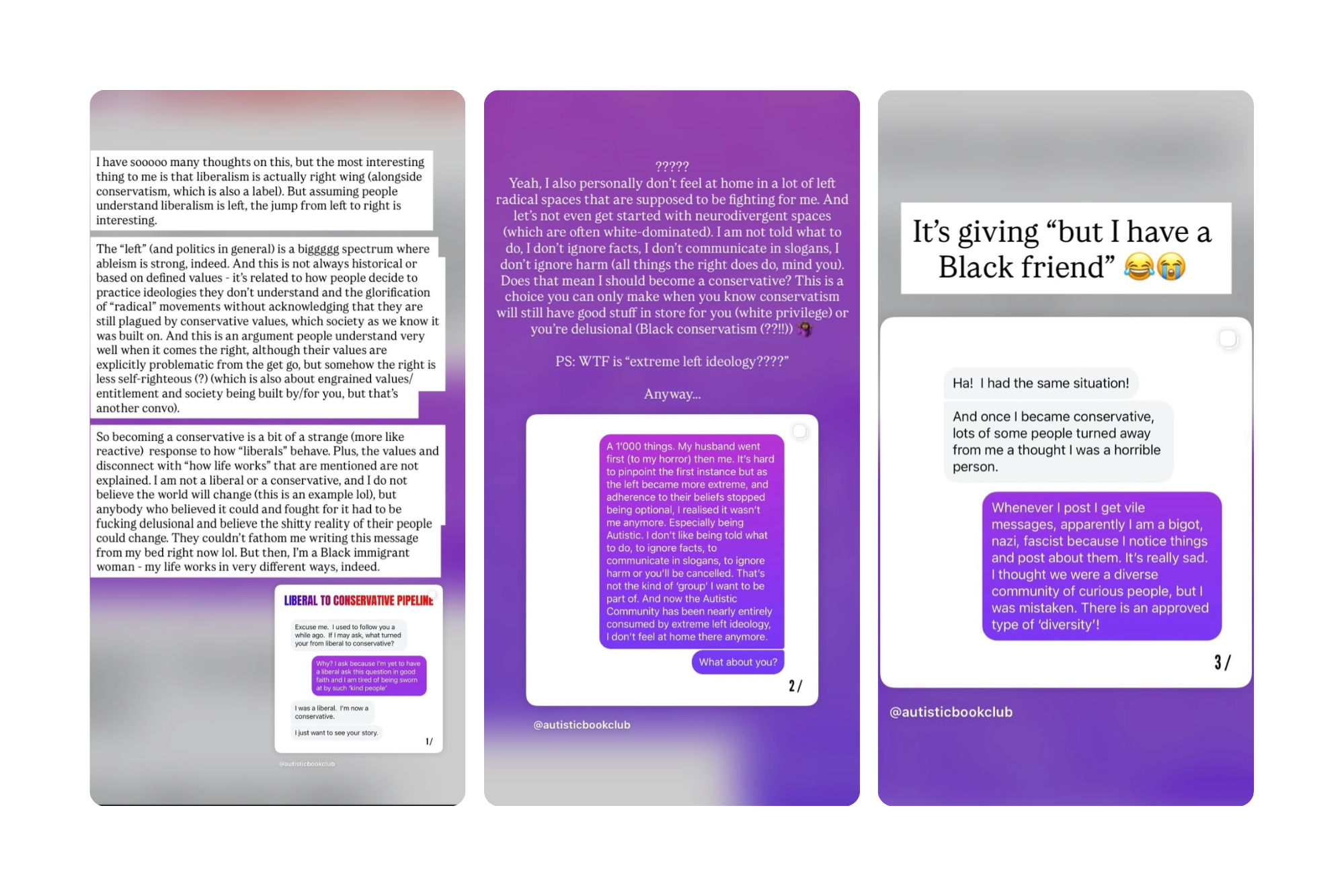 The first thing that stood out to me when I read the post was that these two people understood conservatism as being distinct from liberalism. They are both fundamentally right-wing ideologies. However, assuming people understand that liberal means left, the choice to shift from left to right is interesting, especially given the arguments used to support that position. I shared my thoughts about this dynamic on my Instagram story, never directly engaging with her, and was promptly blocked. This response itself illuminates much of what I want to discuss.